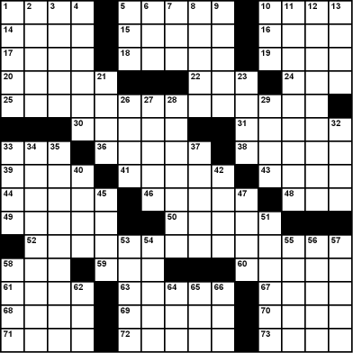 Across 1. Shake additive5. Puddles or Clarabell 10. Curious spheres 14. President of the Twelve Colonies 15. Socially forbidden 16. Solid win 17. Smallest amount 18. Unproven premise 19. Poop, to Guillermo 20. Final leftovers 22. Mom's partner 24. Celestial canvas 25. Beginning of quote by 8-Down/37-Down 30. "Tippe___ and Tyler Too" 31. Semitic scholar 33. Southern constellation resembling an altar 36. Joint cushion 38. Massage deeply 39. Foam weapon 41. Young salmon 43. Sharpshooter William 44. Sinclair who wrote "The Jungle" 46. Map book 48. Counter the effects of gravity 49. Deli unit 50. Troy shiplauncher 52. End of quote 58. First TV brand 59. ___-na-na 60. Concur 61. "To ___ his own" 63. Whole 67. Provoke (to action) 68. "___ girl!" 69. Michael from REM 70. Pig fat 71. Bother 72. "Steppenwolf" author 73. Craft website |
